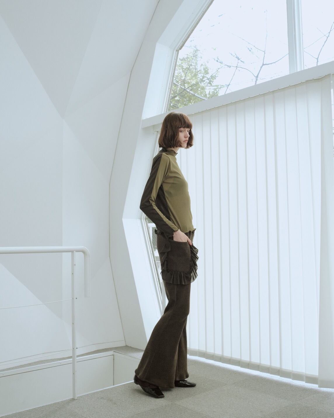 ・ジャージー素材を使用しリラックスして着用可能ながらも、シルエットをこだわり抜いたフレアパンツ。ポケットのフリルデザインはシアー素材を使用 することで大胆ながらも軽さを演出。 カラーはどんなトップスにもスタイリングしやすいブラックとカーキを採用しました。
